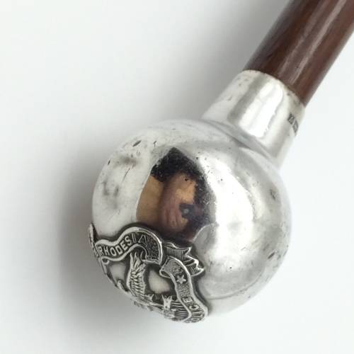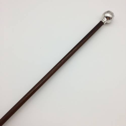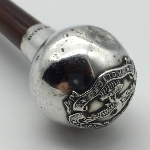 This rare 'Northern Rhodesia Police' swagger stick has a solid silver ball finial which is English hallmarked for Birmingham 1956 and was produced by the silversmiths 'F. NARBOUROUGH' - (F.N.). The stick measures 70cm in length, with a thickness of 1.2cm. The silver ball measures 3cm in diameter. It is in nice condition overall with a few small dents to the finial.
