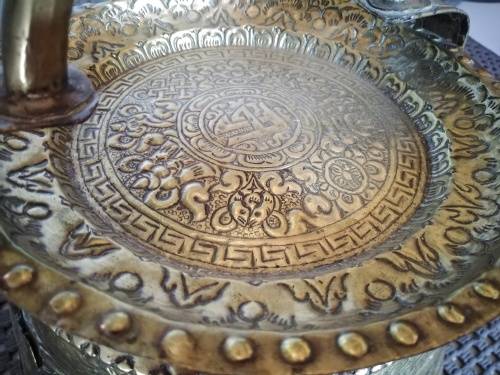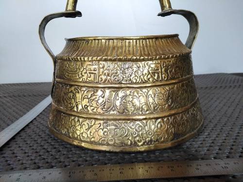 Intricately hand Chased in beautiful floral patterns all round as well as on the matching lid, with Sanskrit symbols around the perimeter as well as on the center of the lid. Very decorative shape with beautiful patina.