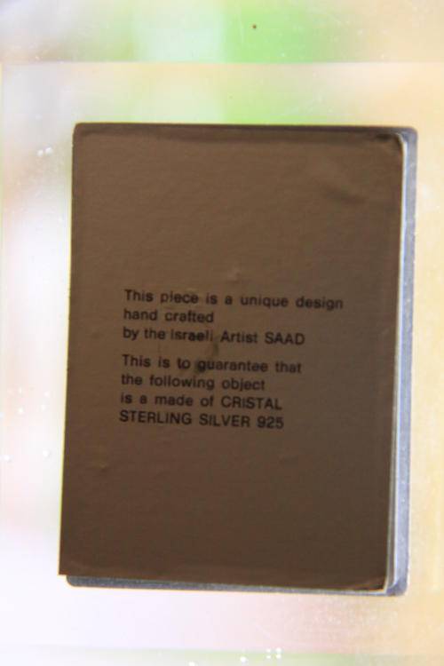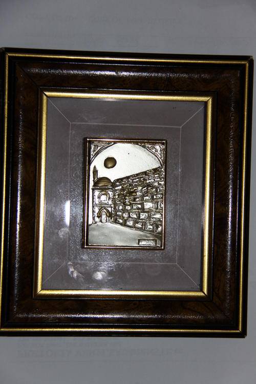 OldCity of Jerusalem sculptured out of a solid brick of pure Sterling Silver. The brick of Sterling Silver is approximately 3" inches in height 2" inches in width, and about 1/2" inch thick and is encassed in a beveled glass frame. The whole pcture including frame is 19cm x 17cm. On the back is the original sticker that reads "This piece is a unique design handcrafted by the Israeli artist SAAD. This is to guarantee that the following object is made of CRISTAL STERLING SILVER .925".