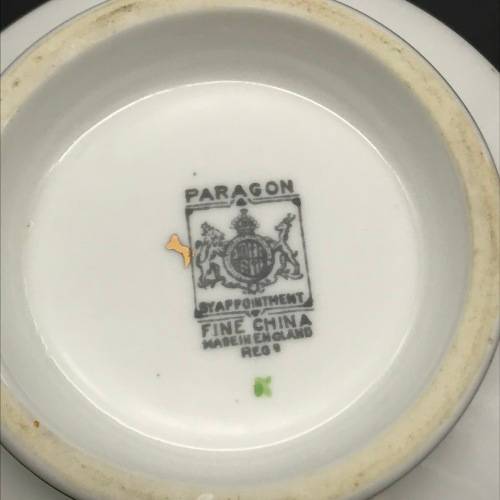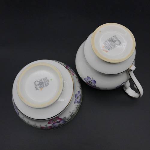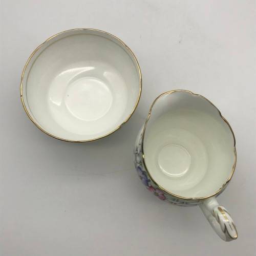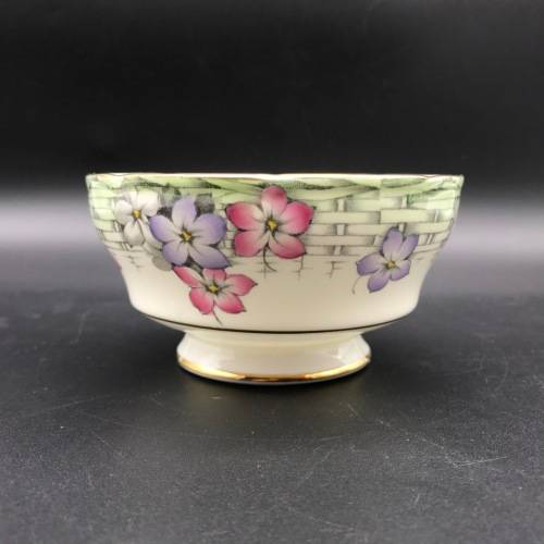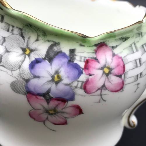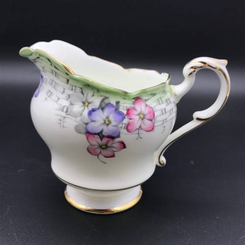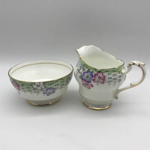 This pretty, fine bone china milk jug & sugar bowl was manufactured in England by Paragon in the 1930's and is decorated with an attractive, rare design that I could not find or trace. Each piece is beautifully decorated with purple, pink and white flowers amongst a grey basket weave with a pale green edge and finished off with a gold trim. The pair are in excellent condition.