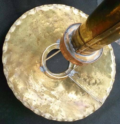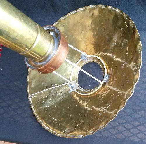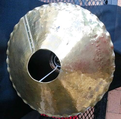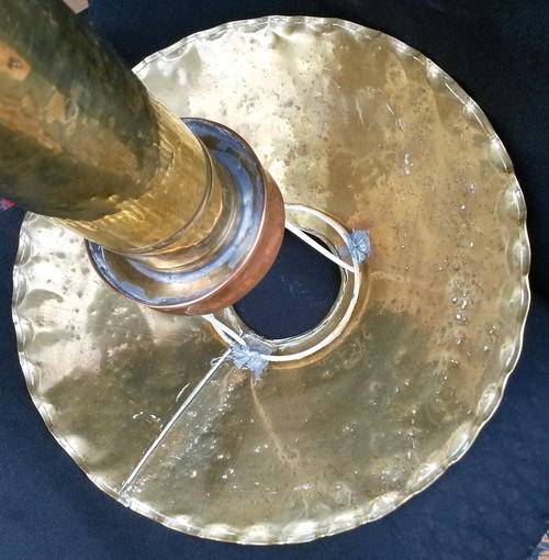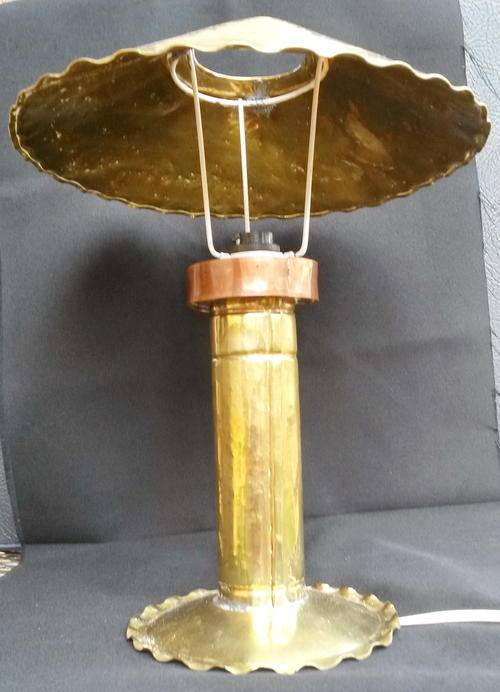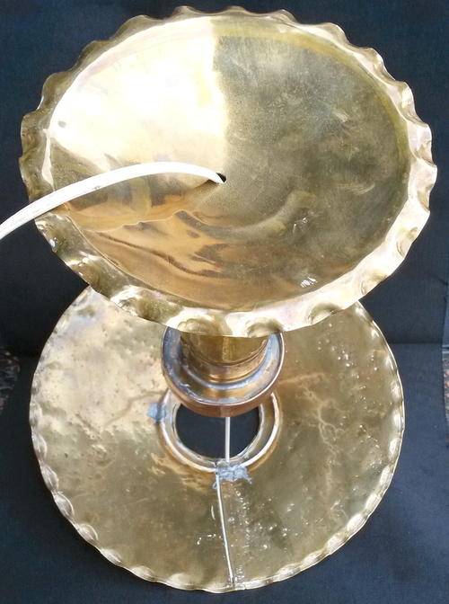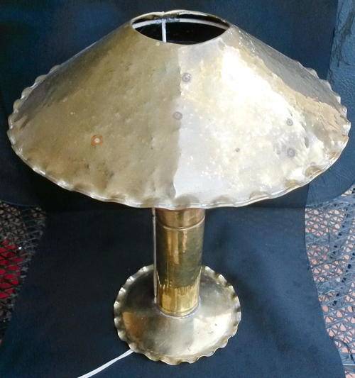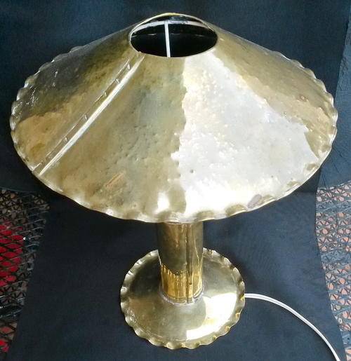 Description: BRASS TABLE LAMP WITH BRASS SHADE. Copper ring where shade connects to lamp. Condition: Good used condition. Left as found, could do with a clean-up. Electrical wire needs to be extended, also needs globe and wall plug. Approximate size: (Brass shade) 290mm diam. x 360mm high (top of shade). Other: Colour of real item could differ slightly from that reflected on pictures. Please regard pictures as part of description.