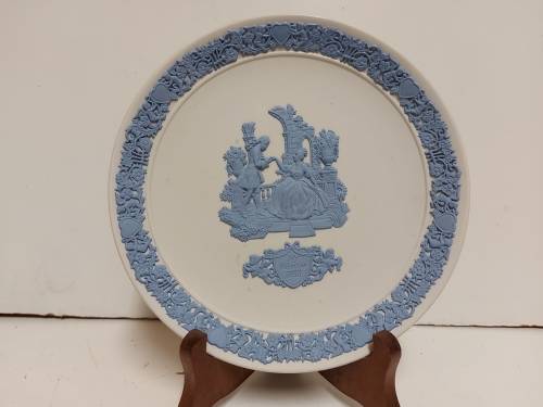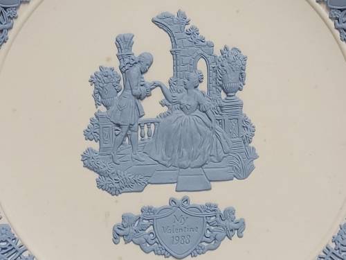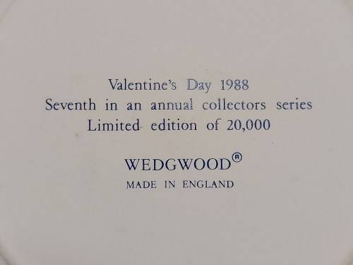 HIGHLY SOUGHT AFTER RARE COLLECTORS SERIES LIMITED EDITION 7 OF 20 000 REVERSE COLOUR WEDGWOOD WHITE JASPERWARE VALENTINE'S DAY 1988 PLATE WITH INTRICATELY CARVED BLUE ON WHITE IMAGES. IT IS IN EXCELLENT CONDITION WITH NO CHIPS OR CRACKS AND MEASURES 16.5 CM IN DIAMETER.