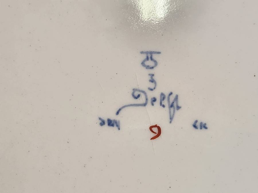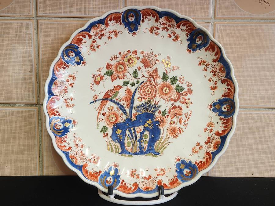 RARE ANTIQUE ROYAL DELFT PIJNACKER IMARI STYLE LARGE CHARGER. THE PIJNACKER DECOR IS INSPIRED BY JAPANESE IMARI CERAMICS AND RESEARCH SHOWS THAT THE BACKMARK ON THIS ARTEFACT WAS USED SINCE 1876. IT IS IN A WELL-PRESERVED CONDITION WITH NO CHIPS OR CRACKS AND MEASURES 4 CM HIGH AND 31.5 CM IN DIAMETER