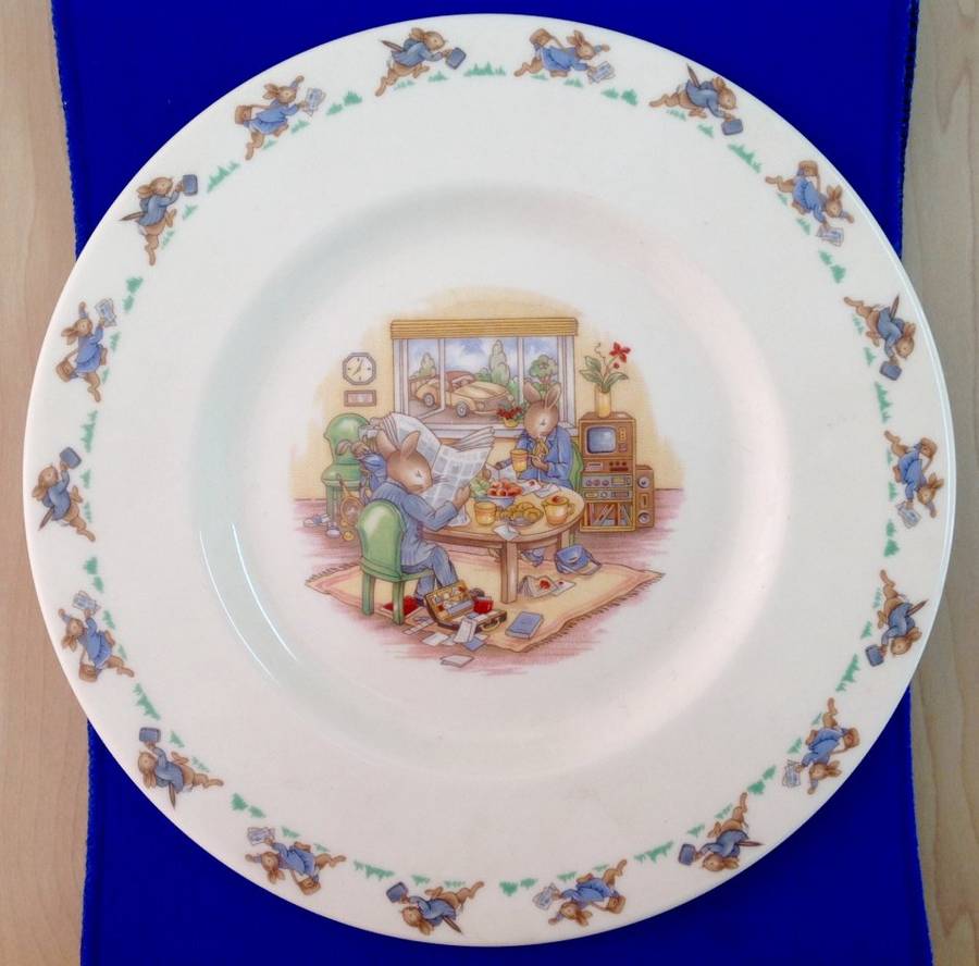 With the shortly-produced Adult Bunnykins range, instead of bunnies running around the plate, there are bunnies with briefcases and umbrellas.