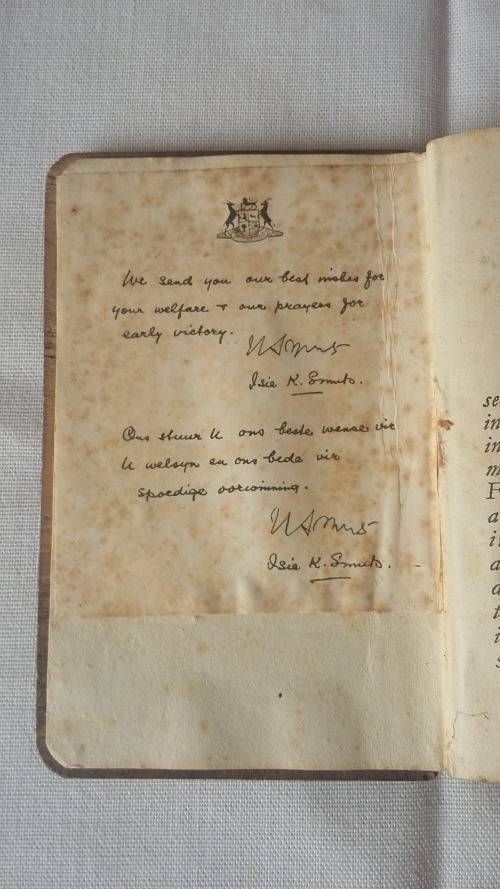Rare New Testament pocket Bible in attractive wooden cover given to SA troops in North Africa with a message of thanks and encouragement signed jointly by Prime Minister General Jan Smuts and his wife, Isie Smuts. The Bible was given to front-line troops as a 1943 Christmas gift from the SA Gifts and Comfort fund.