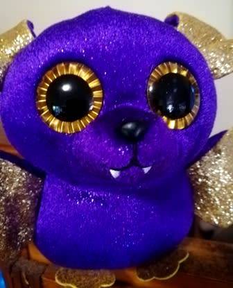 The TY Count the Bat is RARE part of TYs Beanie Boo Halloween range. TY is an instantly recognisable brand is brightly coloured, has highly tactile plush fabric and makes the perfect collectable soft toy. Kids and collectors alike will love this batty Beanie Boo! Featuring a glittery purple and gold coat, glittery paws,ears and wings. This adorable, glitzy doe-eyed stuffed toy bat has synthetic beans that allow it to sit upright on flat surfaces. Count is a friendly companion suited for both playtime and bedtime!