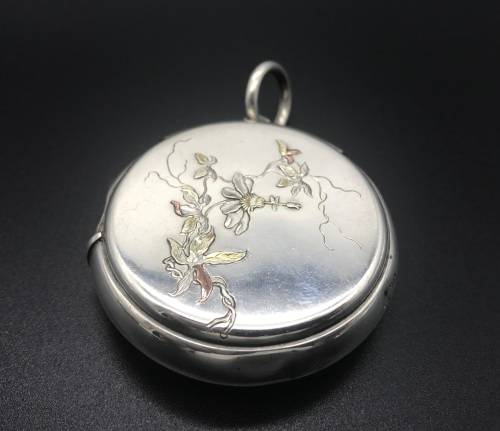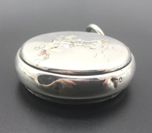 A Stunning Victorian circular vesta case and slow match holder with a hinged lid on the one side and a rotating/ sliding outer case exposing a hidden striker and a hole for the cord of the slow match on the rim. The front and rear has finely worked raised flowers and vines in silver. The box is English hallmarked for London 1879 and stamped J.B. A.J. (Jane Brownett & Alexander Jones)