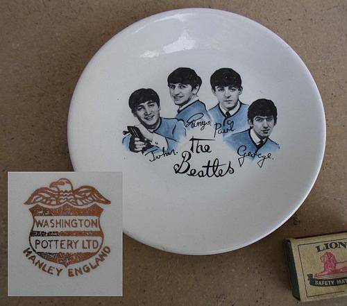 BYGONE ERA, COLLECTABLE EARLY 60'S GENUINE VINTAGE BEATLES MEMORABILIA PLATE MADE BY WASHINGTON POTTERY LTD HANLEY ENGLAND. TRANSFER SCENE WITH SIGNATURES. EXCELLENT CONDITION, NO CHIPS, CRACKS, NOR CRAZING. MARKS FROM PLATE HANGER ON THE BACK, BUT NOT CHIPPED. MEASURES ABOUT 18 CM DIAMETER.