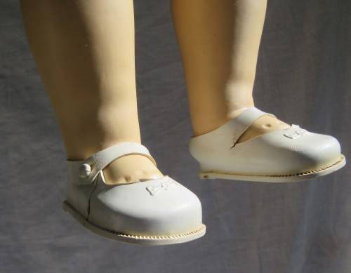 Fresh from an estate, a delightful old doll. Marked Reliable behind her neck and the white plastic shoes she is wearing are marked reliable made in Canada (apparently worth R500 on their own?). The body is elongated and is of a soft almost spongy plastic, no tears or repairs to the body (not sure if it is the original body). Came with a knitted dress and underwear. Hair has been pulled back into pig tails with perished elastic bands. Eyes are intact, but although move and shut, are sticky. Eyelashes missing from right eye lid. Sold As is due to Limited experience with vintage Dolls, study the pictures as these form part of the description. Shoes show tiny splits by the strap, otherwise in very good condition. Doll measures approximately 56 cm long. Shoes fit like Cinderella, so body could be original?