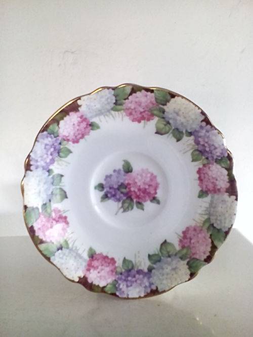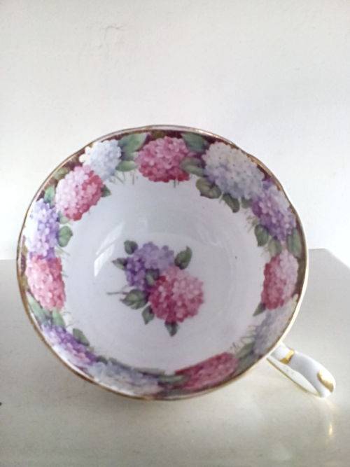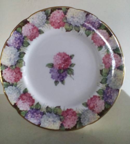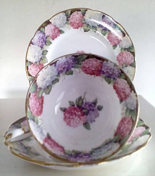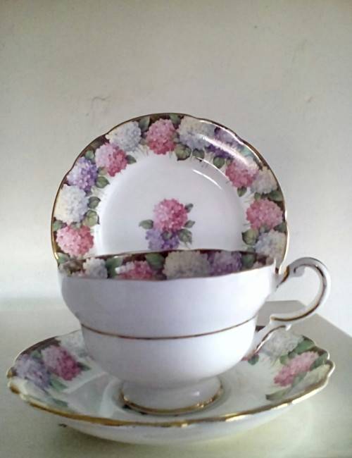 One of the loveliest trios I've had the pleasure to find. Vintage Paragon 'Hydrangeas' tea trio. A symphony of pink, lilac and white flowers festooned to edges and center of cup, saucer and side plate. Gilding very minor loss, but quite good. No damage that I can find.