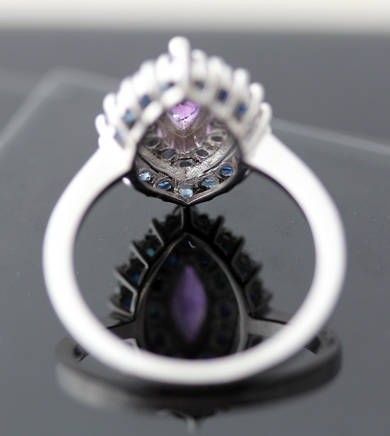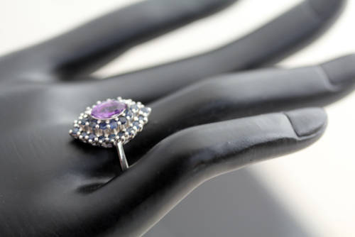 What strikes you first about this remarkable piece is the colour combination - a myriad of purples within the central purple amethyst against dark blue sapphires contrasting with bright, sharp silver. The marquise-cut amethyst of a lovely purple hue is bezel set and beautifully faceted to maximise the sparkle and reflections within the gemstone. Surrounding the amethyst - and echoing the marquise shape - are 30 dark blue round cut sapphires, claw set in sterling silver. There are 2 tiers, one with 12 sapphires and the lower tier, 18 sapphires. The structure that supports the 12mm wide x 19mm long ring head has elongated claws, raising the ring head to a total of 8mm above the finger. A simple, solid shank supports the ring head and bears the 925 hallmark indicating sterling silver. It is vintage but not, I suspect, seriously old. A good solid 4,11 grams and at 19mm long, big enough to attract attention but not unwieldy to wear. Light buff marks but otherwise in good condition. Rather a pretty piece.
