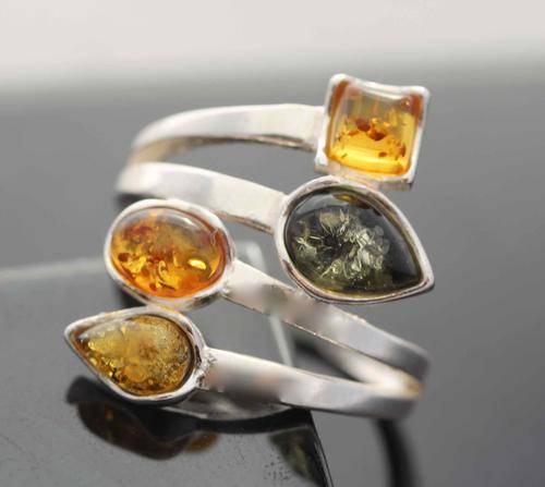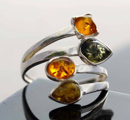 This beautiful tri colour Baltic amber ring is set in sterling silver. The jeweller has carefully crafted four interesting shaped cabochon amber pieces into a twisted ribbon design. Each cabochon amber piece has a distinct colour and has been fashioned into various shapes. There are two tear shaped pieces, one being a lovely and rich dark forest green, and the other bearing a warm and earthy orange/brown hue. The other two honey-hue pieces are shaped into a square and an oval. The shank of the ring is connected at the base of the finger, and is split into four pieces, each band ending with its own amber piece in the ring head. I love the combination of the various coloured amber pieces - the colours complement, as well as enhance each other perfectly! Its handcrafted -an unusual piece!