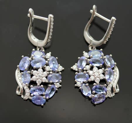 These beautiful earrings are an icy combination of soft lilac-coloured tanzanites, sparkling white cubic zirconias and sterling silver. Drop and dangle, they have 2 elements - the top element is an elongated hook finished with small cubic zirconia accents. The round feature is attached with a sterling silver link that allows plenty of movement. 8 x oval cut tanzanites are claw set in sterling silver surrounding a central flower created with 7 x round cut claw set cubic zirconias as petals. Two serpentine sterling silver strands curl down the one side; one of the strands studded with small cubic zirconias. The openwork between the gemstones has a scattering of single zirconias. Measuring 16mm wide x 31mm long, the earrings weigh 6,13 grams together and bear the 925 hallmark indicating sterling silver. Beautiful!