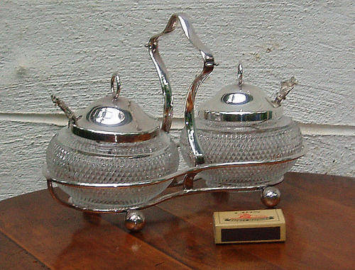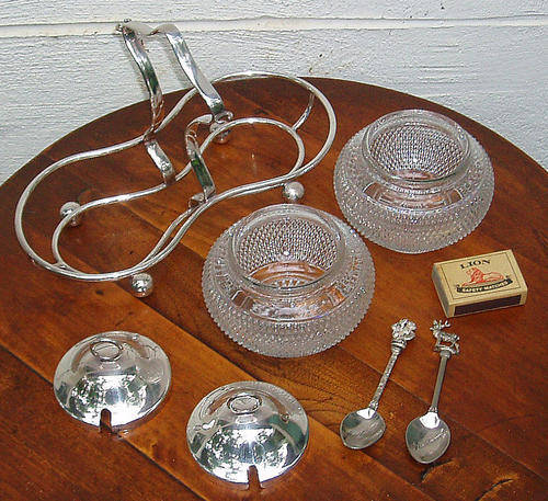 VINTAGE SILVER PLATED FRAME........MARMALADE AND JAM SET FOR THE BREAKFAST TABLE. QUALITY PRESSED GLASS JARS WITH DIAMOND CUT DECORATION LIKE CRYSTAL. SILVER PLATED LIDS TO EACH JAR WITH RING FINIAL FOR EASE OF LIFTING AND RECESS FOR SPOONS. TWO SCOTTISH SPOONS ADDED WITH INTERESTING TOPS TO THEM, ONE SCOTTISH THISTLE AND ONE A DEER (ONE ANTLER LACKING). SP FRAME STAMPED WITH A NUMBER, MAKER NOT CLEAR. FRAME RESTS ON 4 BUN FEET WITH ATTACHMENTS FOR SPOONS TO HANG. GLASS AND STAND IN EXCELLENT CONDITION, NO DAMAGES. ONE LID OF A JAR HAS SOME LIGHT TARNISH AND SLIGHTEST WEAR TO SURFACE, NOT NOTICEABLE. MEASURES ABOUT 23CM WIDEST AND ABOUT 17CM HIGH.SPOONS ABOUT 11CM LONG.