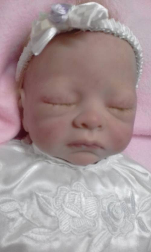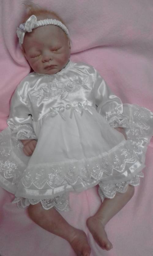 Cutie Molly is about 52cm in length and wears newborn clothing. She is a sleeping baby with honey blonde hair. She has a fitted magnet and not safe around pacemakers etc. Molly is not a toy and should never be given to small children. She is a collectable baby meant for adult collectors.