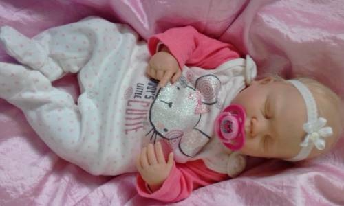Baby is 48cm, rooted hair, vinyl limbs and a soft body.