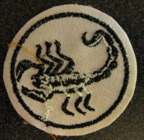 RECCE - HUNTERGROUP SCORPION BADGE - 42 HOURS TRAINING (FOR LEFT SHOULDER). UNOFFICIAL BLACK & WHITE EMBROIDERED ON ORANGE COTTON MATERIAL. THE SCORPION BADGE WAS DESIGNED WITH ONLY 3 PAIRS OF LEGS, THE MISSING PAIR BEING THE HINTER MEMBERS OWN LEGS. ONLY THE LEFT HAND BADGE WAS ISSUED AFTER THE COMPLETION OF THE 1ST 8 SATURDAY AFTERNOON TRAINING SESSION.