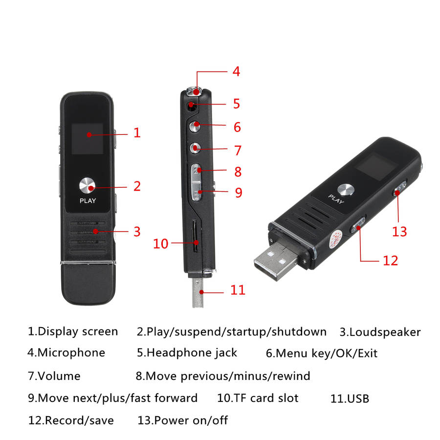 High quality zinc alloy material, durable and feeling comfortable. Super clear recording, recording via high grade built-in microphone. VAR/VOR system (voice activated/operated recording). Playing back via high quality speaker. Recording telephone conversations. LCD screen with color backlight. One key recording and save recording,easy to operate. Working as drive free USB flash disk. MP3 player. Support TFcard recording and playing music. Built-in rechargeable lithium battery. Low battery indicating function. Time stamp, display hours and minute (24 hour format).
