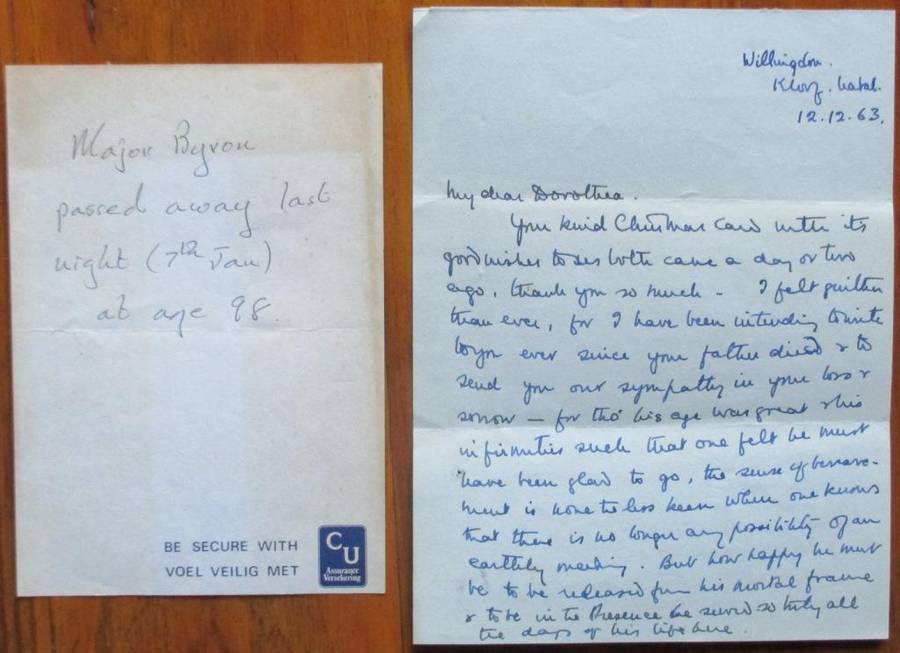 Loosely inserted are: note detailing his death; handwritten letter from Byron's wife to a family friend, Dorothea, dated 12-12-63; and a newspaper cutting from the Highway Mail Special Edition dd January 23rd 1981 recording the varied and colourful career of Major Lewis Byron.