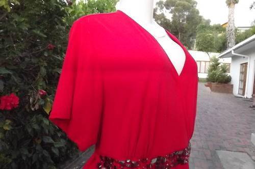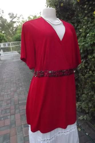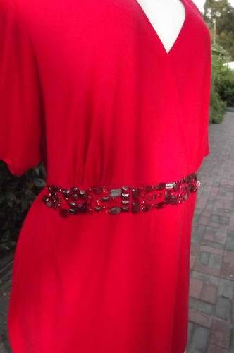 Red Donna Claire top suitable for evening&day wear.Size 46/22.Polyester/Rayon blend with spandex.Crossover bust line.Embellishment with large red beads.Used but in good condition