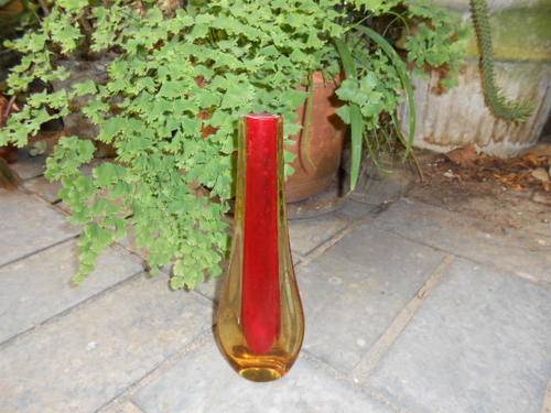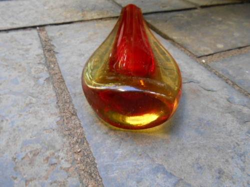 AN INTERESTING PIECE OF GLASS GOLDEN YELLOW WITH A CENTRE OF RED, IT STANDS 26CM.HIGH AND IS QUITE HEAVY . NO MARKINGS.