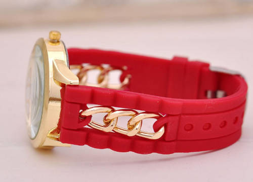This is a beautiful and classic watch with gold coated stainless steel chain on either side of the straps. It adds bling to the silicone strap which is stylish and comfortable to wear on its own. Available in both black and white the watch can add elegance to your collection.