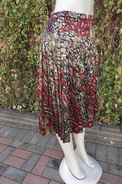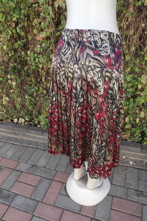 Red,pink,beige and black silky polyester permanent pleated skirt.Size 36/12.Good condition.