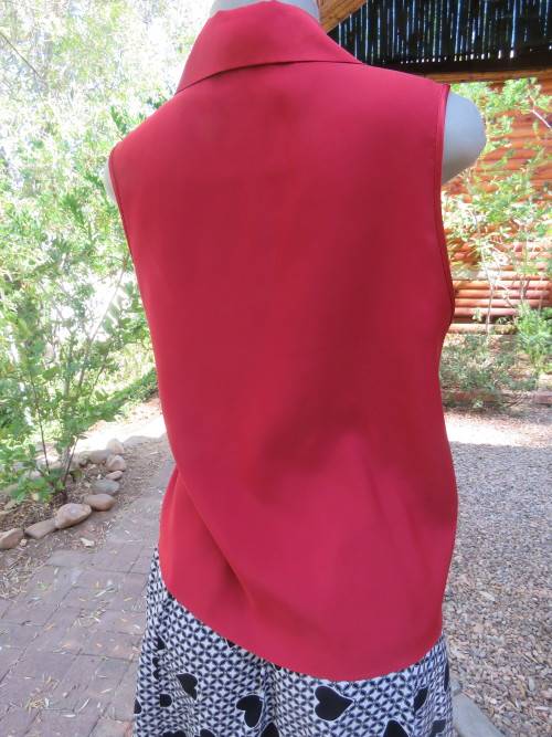 Red silky sleeveless button down top with open collar.Size 35/11 by WOOLWORTHS.