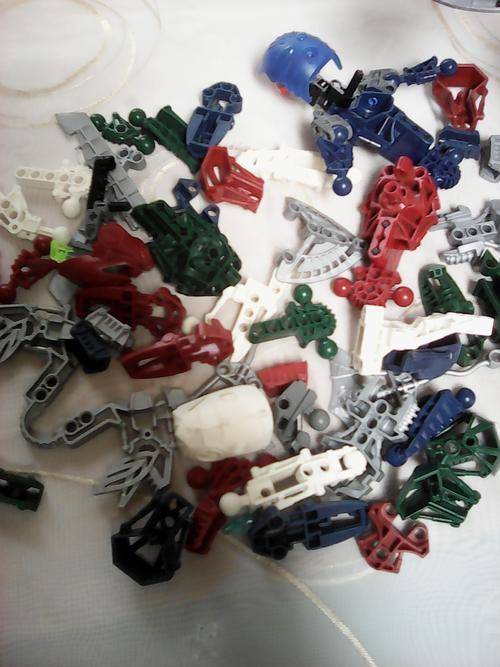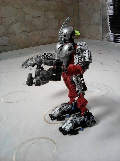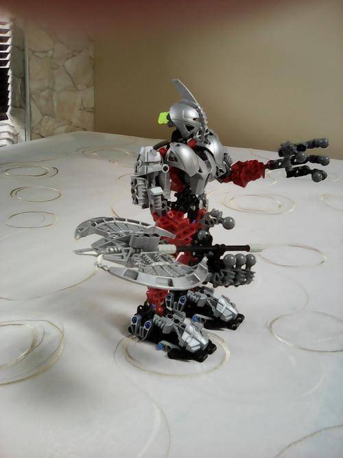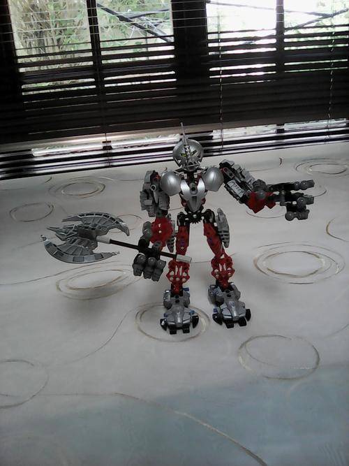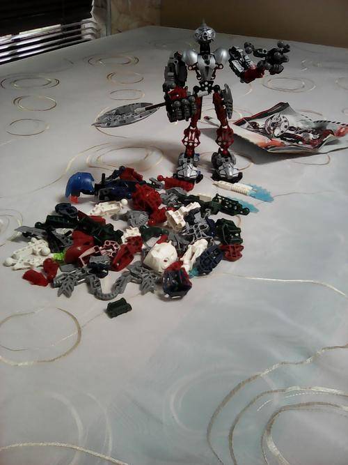 Well loved Red & Silver Bionicle Man with manual and extra "bits". Unfortunately some of the pieces are missing, but the man is still "buildable".