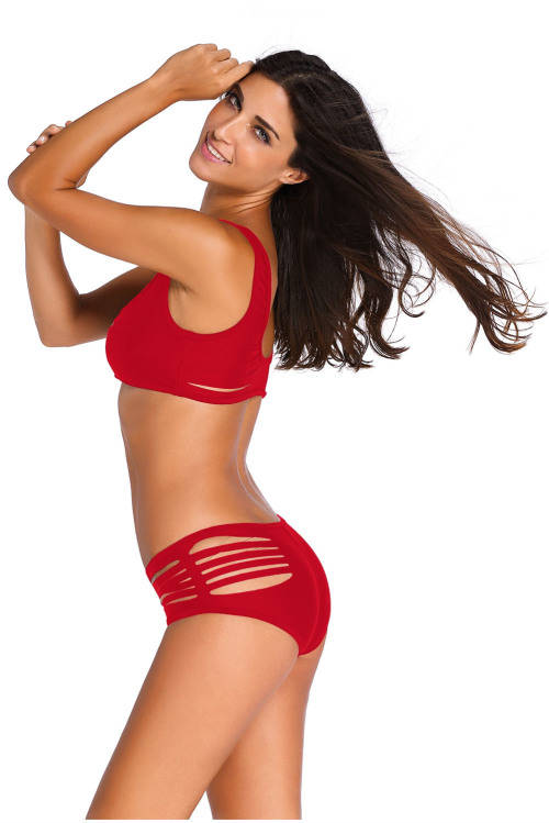 Red Two Piece Shredded Cut Out Bikini Swimsuit Swimwear Costume Beachwear