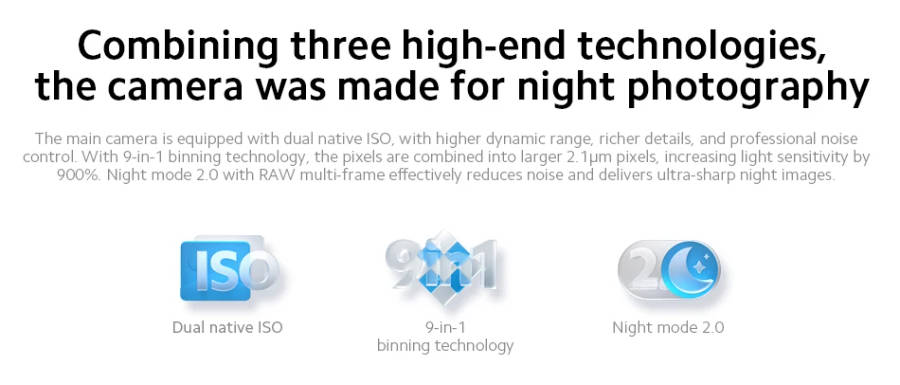 The main camera is equipped with dual native ISO, with higher dynamic range, richer details, and professional noisecontrol. With 9-in-1 binning technology, the pixels are combined into larger 2. 1um pixels, increasing light sensitivity by900%. Night mode 2.0 with RAW multi-frame effectively reduces noise and delivers ultra-sharp night images.