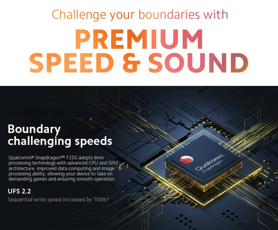 Qualcomm Snapdragon 732G adopts 8nm processing technology with advanced CPU and GPUarchitecture, improved data computing and image processing ability, allowing your device to take on demanding games and ensuring smooth operation.
