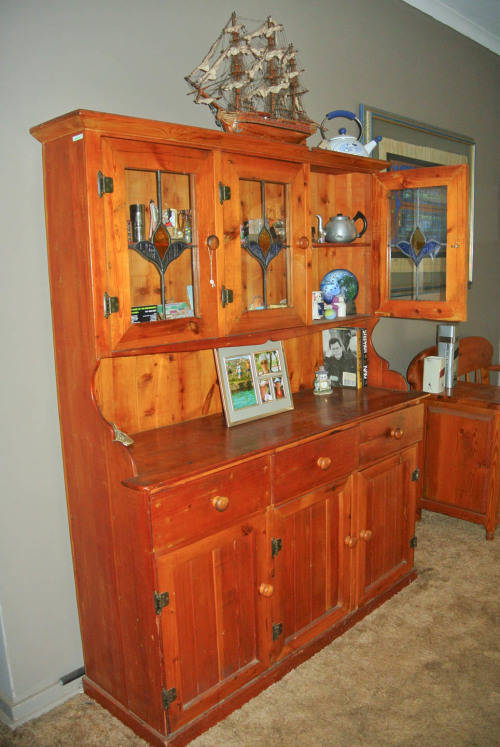 EXQUISITE OREGON DRESSER WITH THREE WOODEN DOORS IN THE LOWER SECTION AND THREE BEAUTIFUL STAINED GLASS DOORS ON THE TOP. THIS IS A WONDERFUL PIECE AS IT CAN BE USED IN A LOUNGE AND LIVING ROOM AREA, WILL LOOK GREAT IN A GUEST HOUSE OR OFFICE. A BARGAIN NOT TO BE MISSED.
