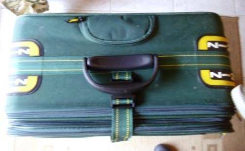 This suitcase is green, secondhand and made by Zino Italy. The pull out handle is broken but it can still be pulled along by the attached top handle to the suitcase and there is also an attached side handle. The suitcase dimensions are 72cm x 49cm and 24 cm deep. There are two outer pockets on the front. There are two compartments to the suitcase and the lower compartment has a lining which has a zyp attaching it at the bottom and the usual elastic straps to hold the clothing. The upper compartment has the usual two straps for holding clothing and then a zyp section in the top cover and that compartment is expandable. The suitcase is in good condition and a good buy. It is a large item and the postage via the post office will be R90 and by courier R230.00