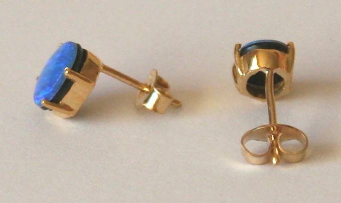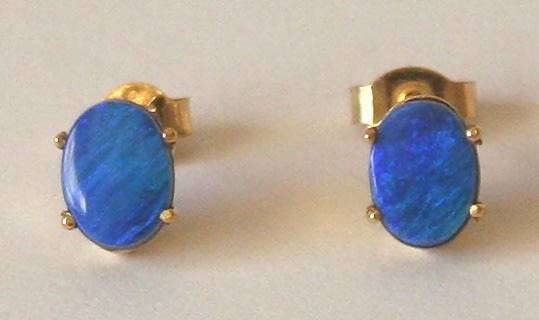 A pair of earrings featuring 2x claw-set 8x6mm oval blue opal doublets, on posts & butterflies.