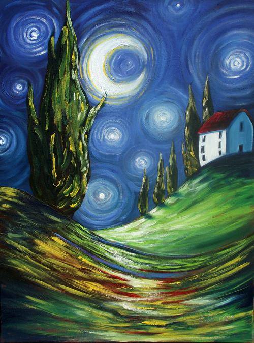 As I have said before, It probably goes without saying that I love the work of Van Gogh. I had a dream the night before I embarked on this painting. I was in a field and was looking up at the night sky and the stars. I'm not sure if the spirit of Van Gogh was with me or if he was standing by my side, but I was being shown how he saw the night sky. How the stars looked like wormholes and were dancing and twinkling. When I woke up I knew exactly how I wanted to paint this picture and this is the product.