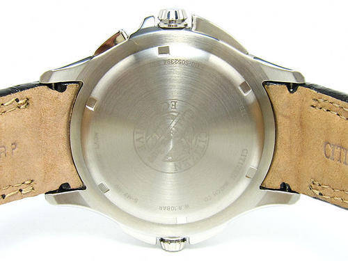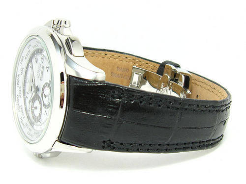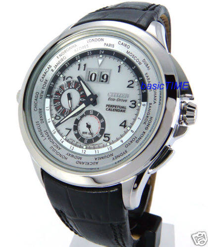 Men's perpetual calendar watch from the Citizen 'Calibre 3150' collection features Citizen Eco-Drive movement as well as stainless steel construction with white dial combined with black leather strap world time dial ring large date display and water resistant to 100 meters. BT0050-09A