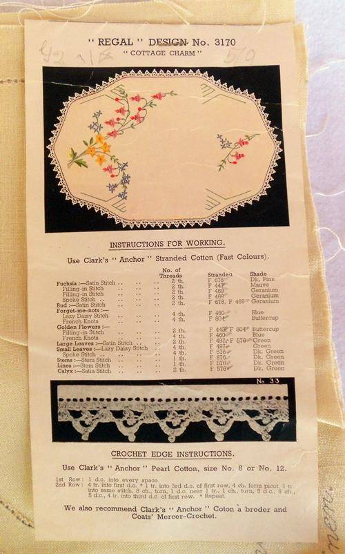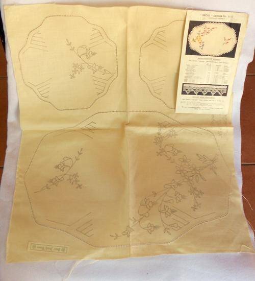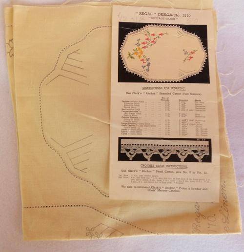 Vintage printed embroidery cloth, Irish linen. Oval Cloth measures 43cm x27cm. Round Cloth x 2 have diameter of 19cm. Clean in as new condition. Printed instructions and colour chart for six strand cotton included. No threads included.