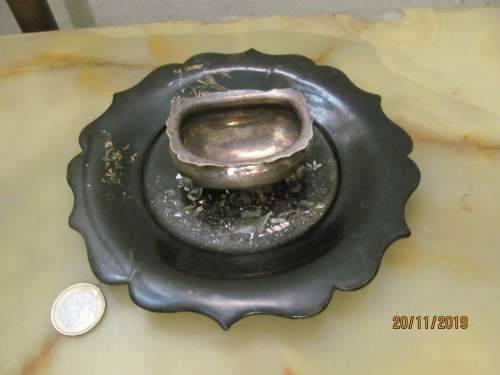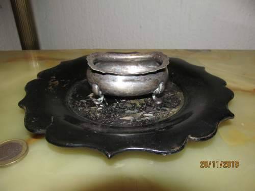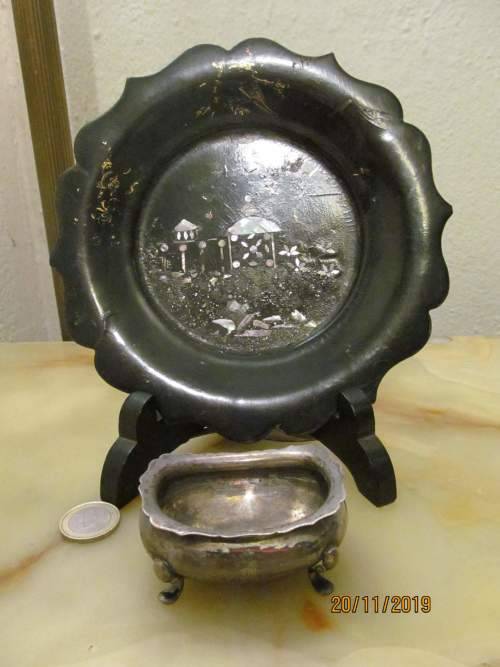 LOT OF VINTAGE 1930-1940's WILLIAM SUCKLING SILVER PLATED FOOTED MUSTARD/SALT POT AND BLACK LACQUERED MOTHER-OF-PEARL INLAY JAPANESE DECORATIVE DISH