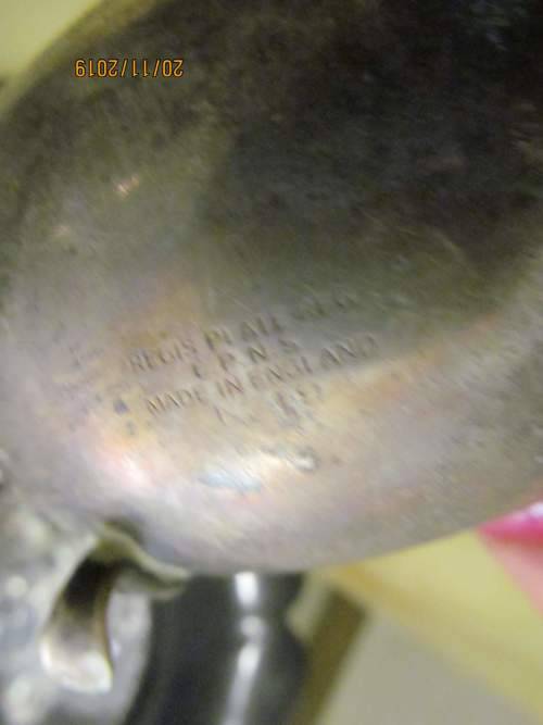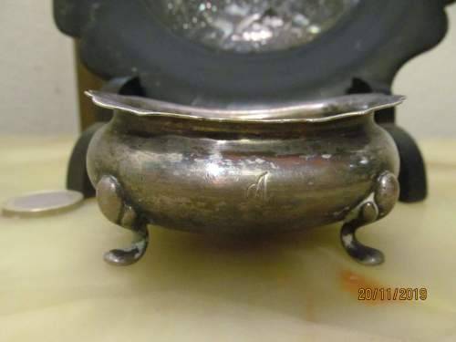 1)- AN OPEN VINTAGE SALT / MUSTARD POT MANUFACTURED UNDER THE TRADE NAME "REGIS PLATE" BY WILLIAM SUCKLING BETWEEN 1930 and THE 1940's. THE POT HAS AN EXTENDED AND SCALLOPED RIM AND STANDS UPON FOUR ATTACHED PLUME MOTIF FEET. IT IS STAMPED UNDERNEATH - "REGIS PLATE REG, EPNS, MADE IN ENGLAND" BESIDES REQUIRING A POLISH THE ITEM IS IN PERFECT CONDITION WITH NO DENTS, RUST OR DAMAGES ETC. IT IS 3,4cm HEIGHT OF RIM.....6.8cm LENGTH ACROSS RIM.....4.7cm WIDTH ACROSS RIM