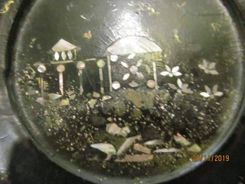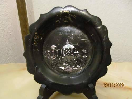2)- A BLACK LACQUERED DECORATIVE PAPIER MACHE DISH PROBABLY MANUFACTURED IN JAPAN. THE ITEM HAS A SCALLOPED RIM AND IS DECORATED ALONG THE VERGE IN GOLD PAINTED FADED PATTERNS WITH MOTHER-OF-PEARL INLAY AT THE CENTER DEPICTING A PAGODA-LIKE STRUCTURE WITH LANDSCAPE SETTING. THIS DISH HAS A SMALL CRACK ON THE RIM ON OPPOSITE SIDES AND ALTHOUGH NOT VISIBLE DUE TO THEIR NATURE, ARE THERE. ASIDE FROM THIS THE DISH HAS NO CHIPS, DAMAGES ETC. IT IS NOT MARKED OR STAMPED. 1.4cm HEIGHT OF RIM..... 9.8cm DIAMETER OF BASE.....17.5cm DIAMETER OF RIM