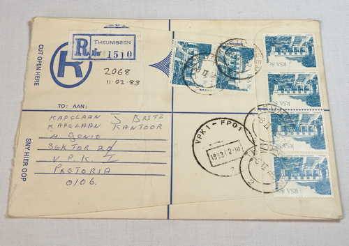 Registered letter from Theunissen to Pretoria with Field Post Office 1 cancel 10 Feb 1983