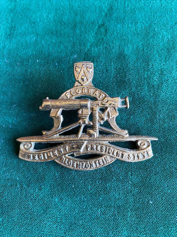 REGT. PRESIDENT STEYN CAST CAP BADGE-WORN WW2- 2 LUGS