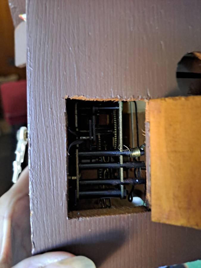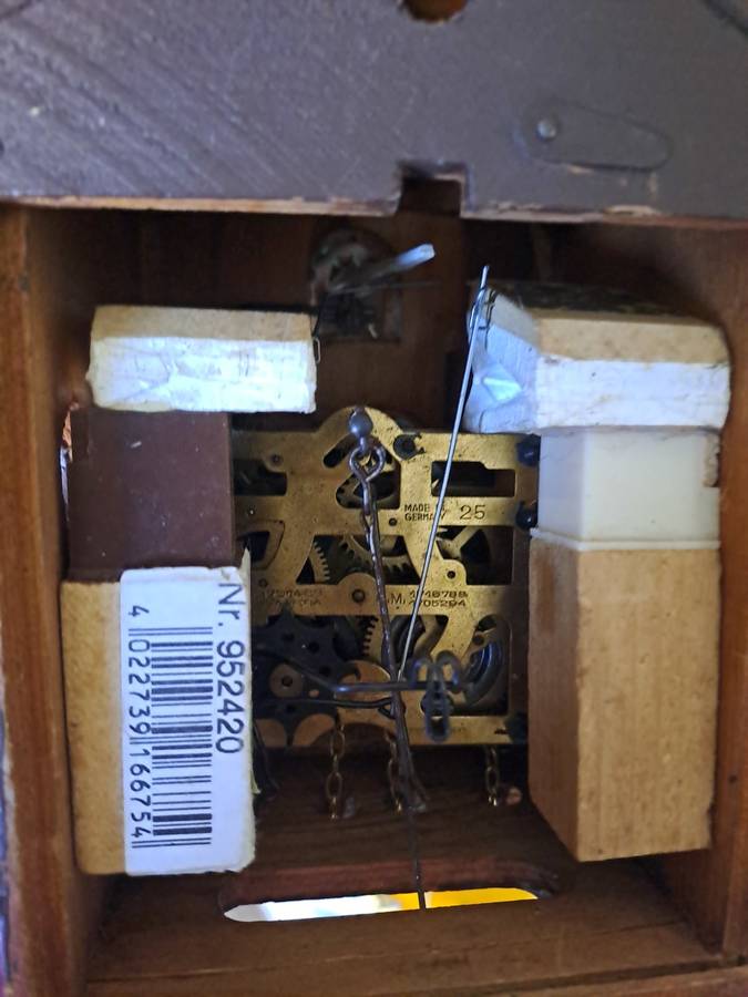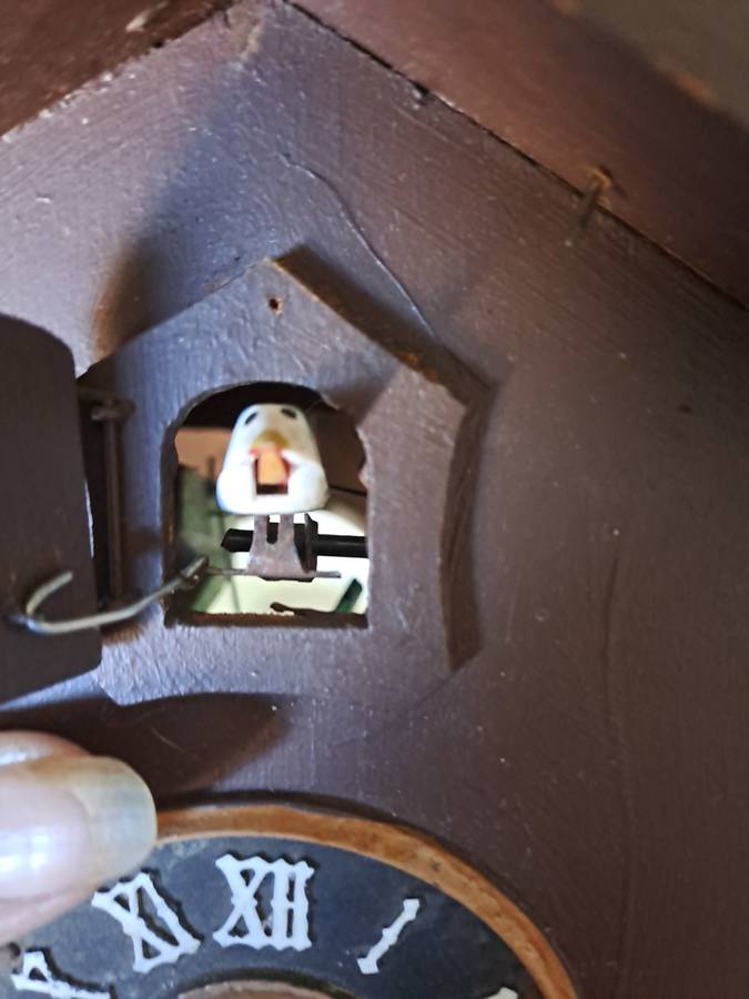 this poor clock is in need of a bit of TLC. unfortunately the surround is broken and needs to repaired. the cuckoos/bellows are fine. it ticks for a while but stops so presumably needs a good clean. comes with the chains