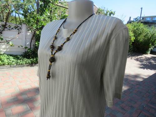 Reliable pull-over beige short sleeve top in vertical stripe design with blend of acetate,poly mide and nylon.Size 36/12 by 'TRU'.Round neck with opening at back,closing with loops and 2 buttons.As new.
