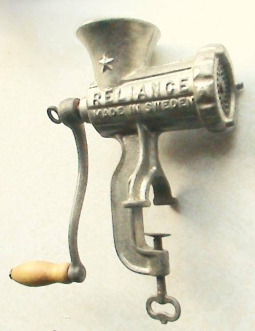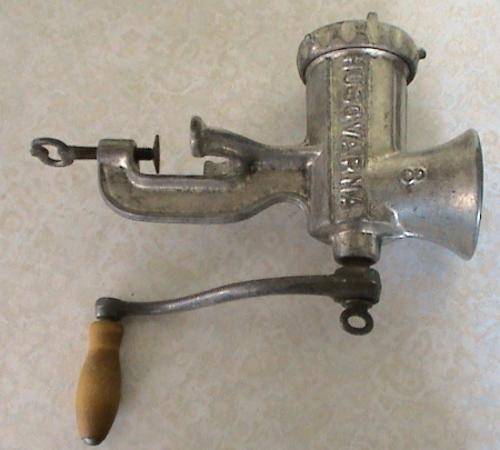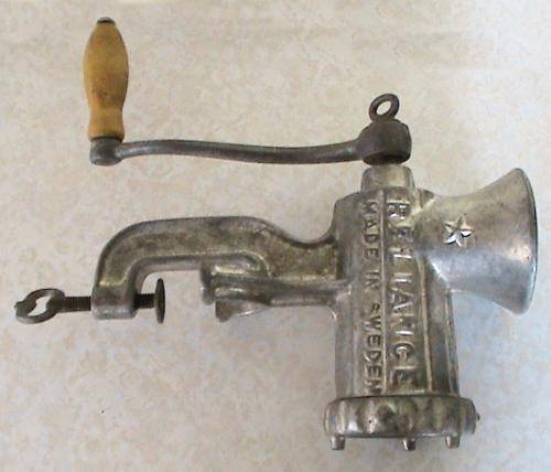 This RELIANCE made in Sweden no 8 Husqvarna Steel Mincer was purchased circa 1950's. It was used by only one person who cared for it always and made sure that it was always well cleaned and dried, so that it is now still in an excellent pre-owned condition and still usable. There is no oxidation, and the wooden handle is well preserved.