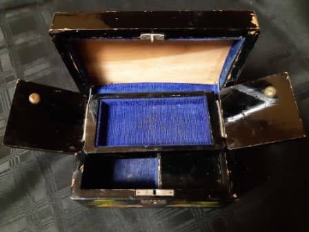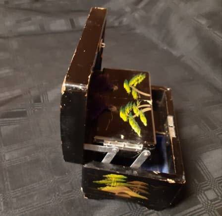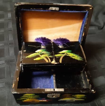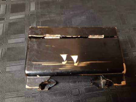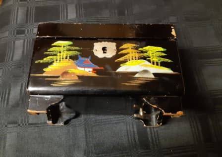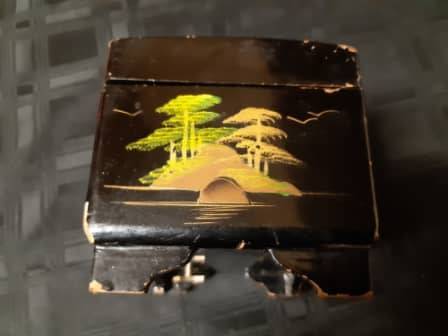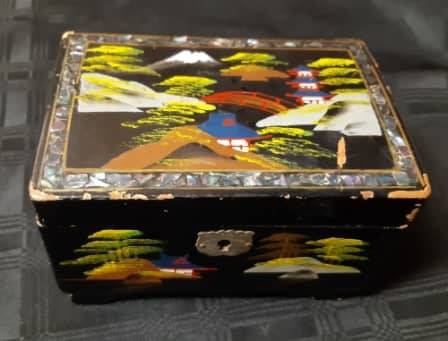 REMARKABLE AND HIGHLY ADORNED ANTIQUE ORIENTAL HAND PAINTED, FOOTED MUSICAL JEWELRY BOX WITH A WIND-UP MECHANISM AND WORKING. THIS HIGHLY COLLECTIBLE ITEM DISPLAYS STUNNING AND METICULOUSLY HAND-PAINTED IMAGES ALL AROUND THE BOX AND MOTHER OF PEARL INLAYS TO THE TOP AROUND THE EDGES. IT HAS SOME AGE RELATED CHIPS ON THE BLACK LAQUERED SURFACE, BUT NO DAMAGE TO THE WOOD OR HINGES. THERE IS NO KEY. IT MEASURES 150 X 100 MM, AND 95 MM IN HEIGHT