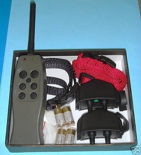 Brand new dog training collars with one remote control. Can be used to train two small to big dogs at the same time. It is easy to use; great for training your dog(s). FEATURES * One remote control can operate the trainings of two dogs up to 300 meters away. * The three different static impulse and vibration calls can meet the needs of different situations * The soft conductive rubber electrode will discharge impulses through the pet's hairs without direct touch of the skin. * The high static impulses can quickly and effectively curb the improper behavior of the pet * The auto on-off switch for battery saving * Water-resistant collar Collar Weight 65 (receiver+battery) Collar strap length adjustable: 20-50 cm Collar size 30mmx58mmx34mm Power: 4x4LR44 6V batteries Water-resistant and shockproof Handset Weight 90g (w/battery) Length 120mmx45mmx25mm Power: 1x9V battery LED signal light Water-resistant What you will get * TWO dog training collars w/4 batteries * One remote control w/battery * Instructions * gift box