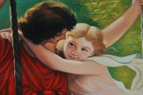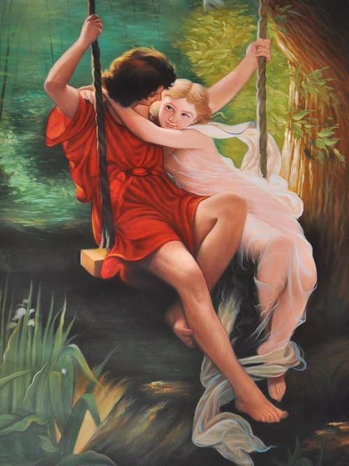 Exquisite Renaissance style painting of a beautiful nymph on a swing with her companion. The detailing is flawless and the colours are intense. Excellent quality. A beautiful painting that will make you feel like you are in a Venetian Villa!