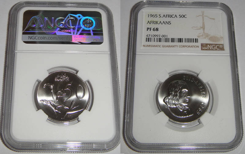 Republic of South Africa : Fifty Cent (50c) of 1965 (Afrikaans) : NGC graded PF 68